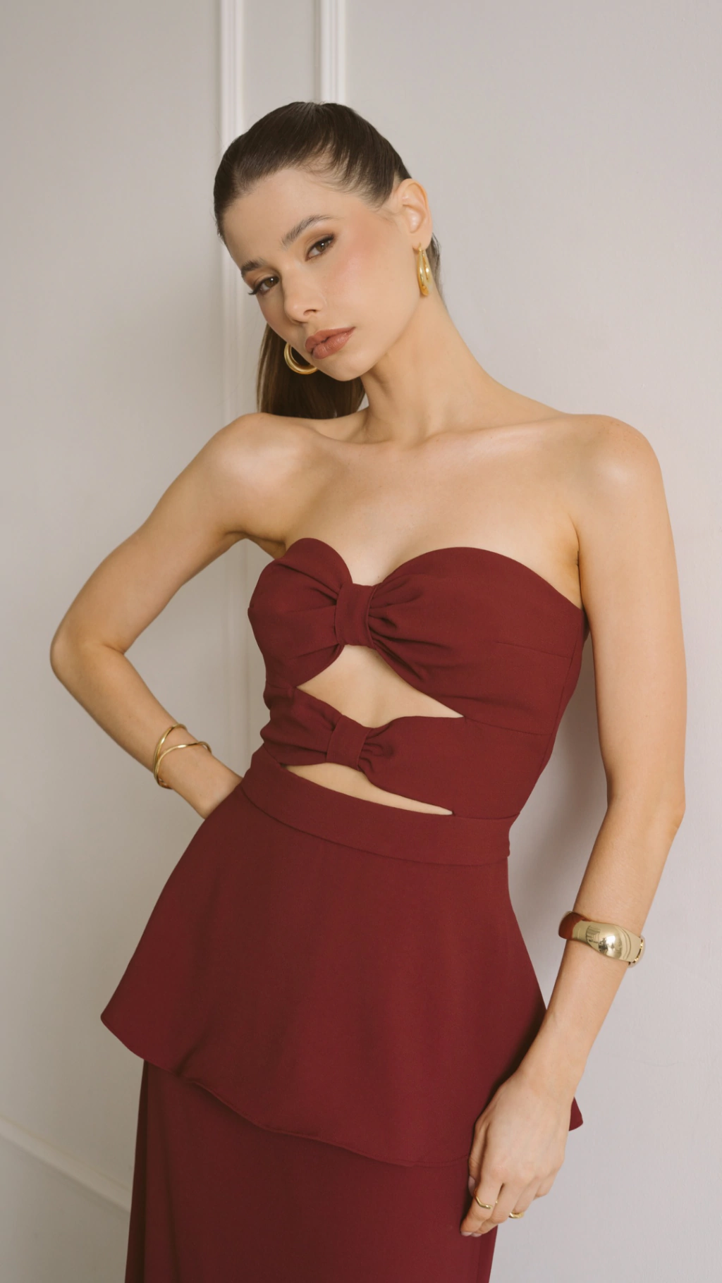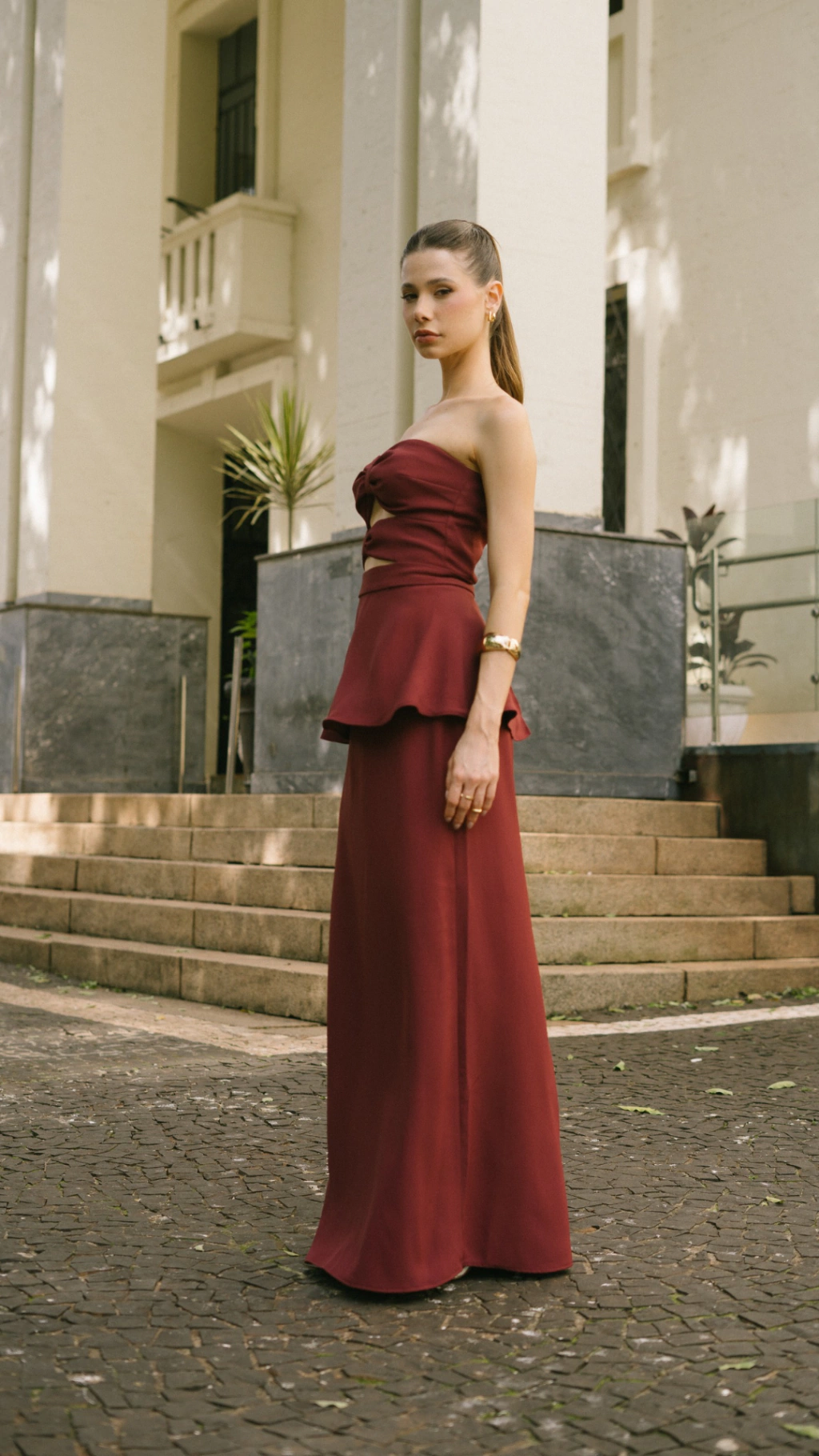 Vestido longo, confeccionado no crepe de acetato. Decote tomara que caia com recortes, possui fita de silicone para dar mais segurança ao vestir. Além disso, a peça possui um elástico interno com fecho, para "prender" no corpo. Possui peplum na cintura, por cima de uma saia longa e reta, com leve evasê. Na parte de trás, a saia possui fenda para melhor movimento ao andar.