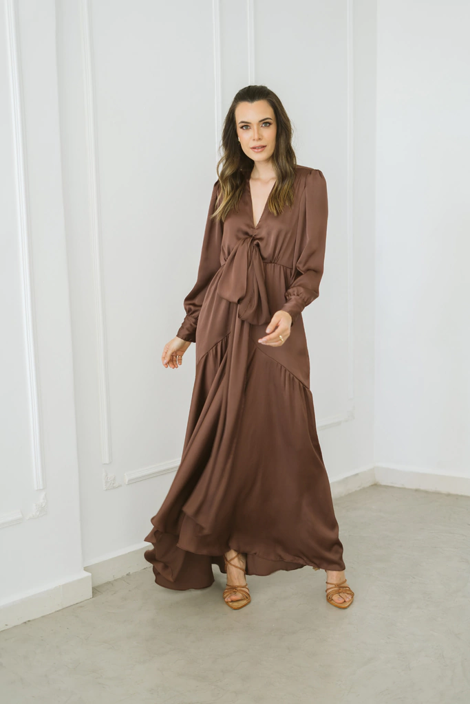 Vestido longo, com a parte da frente mais curta que as costas. Manga longa com botões encapados no punho, decote V, e uma faixa presa ao vestido na parte frontal. Pode ser dado a volta na cintura, para amarração nas costas.